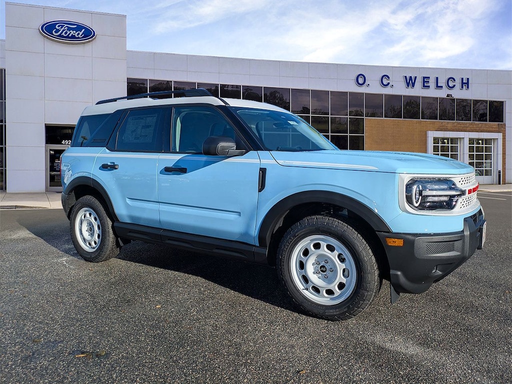 ****SHIPPING AVAILABLE NATIONWIDE! COMPLETE THE ENTIRE TRANSACTION WITHOUT COMING TO THE SHOWROOM!**** O C Welch Ford is pleased to offer this good-looking 2025 Ford Bronco Sport Robins Egg Blue Heritage with the following features: Convenience Package (Front Driver/Passenger Seat Back Map Pockets, Heated 8-Way Power Driver's Seat, LED Fog Lamps, Premium Wrapped Steering Wheel, and Universal Garage Door Opener (UGDO)), Equipment Group 250A, 4-Wheel Disc Brakes, 6 Speakers, ABS brakes, Air Conditioning, Alloy wheels, AM/FM radio: SiriusXM, AM/FM Stereo, Auto High-beam Headlights, Automatic temperature control, Brake assist, Cargo Mat, Compass, Cruise Control, Delay-off headlights, Driver door bin, Driver vanity mirror, Dual front impact airbags, Dual front side impact airbags, Electronic Stability Control, Emergency communication system: SYNC 4 911 Assist, Four wheel independent suspension, Front & Rear Floor Liners w/o Carpet Mats, Front anti-roll bar, Front Bucket Seats, Front Center Armrest, Front reading lights, Fully automatic headlights, Heated door mirrors, Illuminated entry, Knee airbag, Low tire pressure warning, Occupant sensing airbag, Outside temperature display, Overhead airbag, Overhead console, Panic alarm, Passenger door bin, Passenger vanity mirror, Plaid Cloth Front Bucket Seats, Power door mirrors, Power Moonroof, Power steering, Power windows, Radio data system, Rear anti-roll bar, Rear Parking Sensors, Rear reading lights, Rear seat center armrest, Rear window defroster, Rear window wiper, Remote keyless entry, Security system, SiriusXM, Speed-sensing steering, Speed-Sensitive Wipers, Split folding rear seat, Steering wheel mounted audio controls, SYNC 4 w/Enhanced Voice Recognition, Tachometer, Telescoping steering wheel, Tilt steering wheel, Traction control, Trip computer, Variably intermittent wipers, and Wheels: 17" Oxford White-Painted Aluminum. Factory MSRP: $40,435 $3,554 off MSRP!