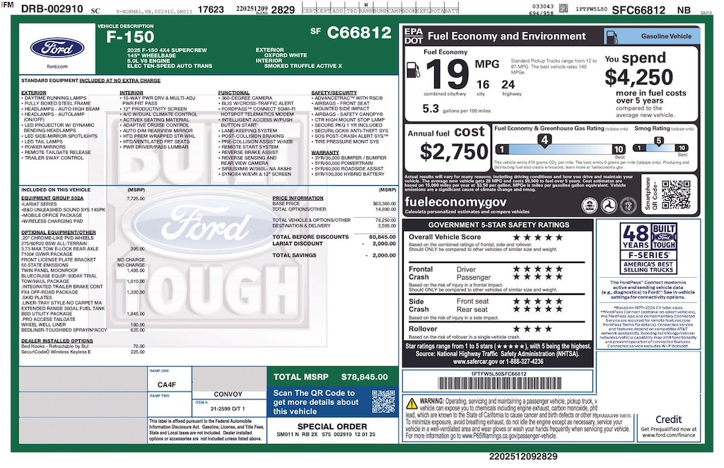 ****SHIPPING AVAILABLE NATIONWIDE! FREE SHIPPING AVAILABLE UP TO 300 MILES! COMPLETE THE ENTIRE TRANSACTION WITHOUT COMING TO THE SHOWROOM!**** This 2025 Ford F-150 Lariat is loaded with the following Factory Options:Bed Utility Package (4 Pickup Box Tie-Down Plates, LED Box Lighting, Power Tailgate, and Pro Access Tailgate), Equipment Group 502A High (2nd Row Heated Seats, Ambient Lighting - Ice Blue Color Only, Heads-Up Display, Illuminated Driver & Passenger Visors, Power-Sliding Rear Window, Radio: B&O Unleashed Sound System by Bang & Olufsen, and Wheels: 20" Chrome-Like PVD), FX4 Off-Road Package (4x4 FX4 Off-Road Bodyside Decal, Hill Descent Control, Monotube Rear Shocks, Off-Road Tuned Front Shock Absorbers, Rock Crawl Mode, and Tray Style Floor Liner w/o Carpet Mats), Mobile Office Package (Console Worksurface, Partitioned Lockable Rear Storage, and Wireless Charging), Tow/Haul Package, 4-Wheel Disc Brakes, 6" Extended Running Boards, 8 Speakers, ABS brakes, ActiveX Trimmed Bucket Seats, ActiveX Trimmed Smoked Truffle Bucket Seats, Adjustable pedals, Air Conditioning, Alloy wheels, AM/FM radio: SiriusXM with 360L, Auto High-beam Headlights, Auto-dimming door mirrors, Auto-dimming Rear-View mirror, Automatic temperature control, B&O Sound System, Brake assist, Bumpers: chrome, Chrome wheels, Compass, Cruise Control, Delay-off headlights, Driver door bin, Driver vanity mirror, Dual front impact airbags, Dual front side impact airbags, Electronic Stability Control, Emergency communication system: SYNC 4 911 Assist, Front anti-roll bar, Front Bucket Seats, Front Center Armrest, Front dual zone A/C, Front fog lights, Front License Plate Bracket, Front reading lights, Front wheel independent suspension, Fully automatic headlights, Garage door transmitter, Heated front seats, Heated door mirrors, Heated steering wheel, Illuminated entry, Internet access capable: FordPass Connect 5G, Low tire pressure warning, Memory seat, Navigation system: Connected Navigation, Occupant sensing airbag, Outside temperature display, Overhead airbag, Overhead console, Panic alarm, Passenger door bin, Passenger vanity mirror, Pedal memory, Power door mirrors, Power driver seat, Power passenger seat, Power steering, Power windows, Radio data system, Rain sensing wipers, Rear reading lights, Rear seat center armrest, Rear step bumper, Rear window defroster, Remote keyless entry, SecuriCode Keyless-Entry Keypad, Security system, Split folding rear seat, Steering wheel mounted audio controls, SYNC 4 w/Enhanced Voice Recognition, Tachometer, Telescoping steering wheel, Tilt steering wheel, Tough Bed Spray-In Bedliner, Traction control, Trip computer, Turn signal indicator mirrors, Twin Panel Moonroof, Variably intermittent wipers, Ventilated front seats, Voltmeter, Wheel Well Liner, and Wheels: 18" Chrome-Like PVD. Factory MSRP: $78,845 $8,663 off MSRP!