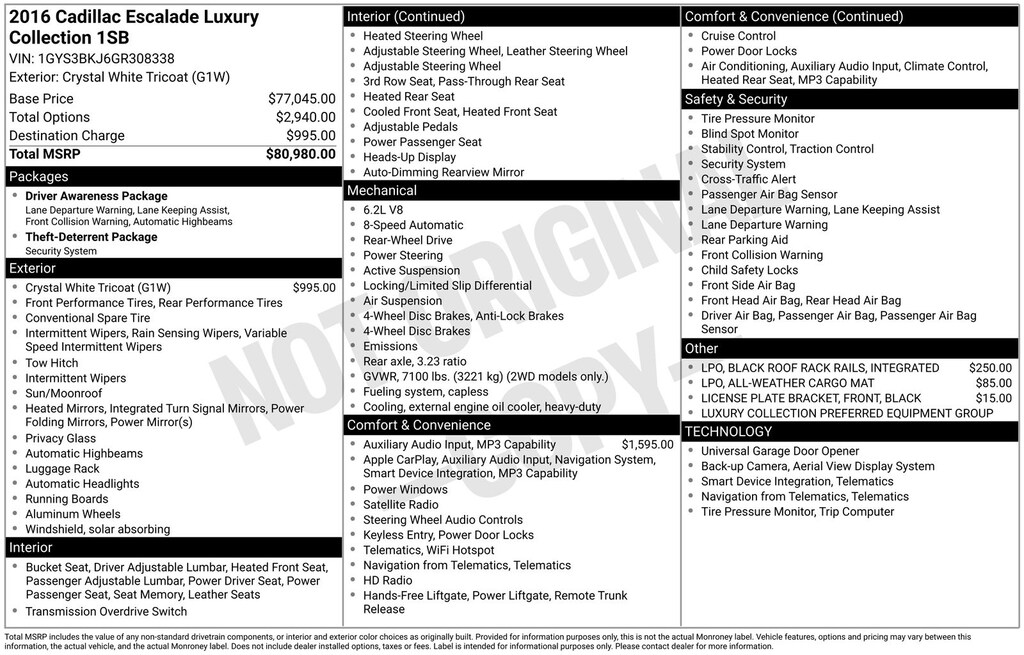 ****SHIPPING AVAILABLE NATIONWIDE! FREE SHIPPING AVAILABLE UP TO 300 MILES! COMPLETE THE ENTIRE TRANSACTION WITHOUT COMING TO THE SHOWROOM!**** O C Welch is proud to present you with another True Market Priced Pre-Owned Vehicle. This 2016 Cadillac Escalade Luxury is loaded with the following Factory Options:Driver Awareness Package (Forward Collision Alert, IntelliBeam Headlamps, and Lane Keep Assist), Preferred Equipment Group 1SB (Power Tilt-Sliding Sunroof w/Express-Open/Close, Rear Cross-Traffic Alert, Reconfigurable 4-Color Head-Up Display, Second Row Bucket Seats, and Side Blind Zone Alert), Theft-Deterrent Package (Theft-Deterrent Alarm System, Vehicle Inclination Sensor, and Vehicle Interior Movement Sensor), 16 Speakers, 3.23 Axle Ratio, 3rd row seats: split-bench, 4-Wheel Disc Brakes, ABS brakes, Adaptive suspension, Adjustable pedals, Air Conditioning, All-Weather Cargo Mat (LPO), Alloy wheels, AM/FM radio: SiriusXM, Apple CarPlay, Auto High-beam Headlights, Auto tilt-away steering wheel, Auto-dimming door mirrors, Auto-dimming Rear-View mirror, Auto-leveling suspension, Automatic temperature control, Black Front License Plate Bracket, Black Integrated Roof Rack Rails (LPO), Bodyside moldings, Bose Centerpoint Surround Sound System, Brake assist, Bumpers: body-color, CD player, Compass, Cruise Control, Delay-off headlights, Driver door bin, Driver vanity mirror, Dual front impact airbags, Dual front side impact airbags, DVD-Audio, Electronic Stability Control, Emergency communication system: OnStar, Exterior Parking Camera Rear, Front anti-roll bar, Front Bucket Seats, Front Center Armrest w/Storage, Front dual zone A/C, Front reading lights, Front wheel independent suspension, Fully automatic headlights, Garage door transmitter, HD Radio, Heads-Up Display, Heated front seats, Heated & Cooled Front Bucket Seats, Heated door mirrors, Heated rear seats, Heated steering wheel, Illuminated entry, Lane Departure Warning System, Leather Seating Surfaces, Leather Shift Knob, Leather steering wheel, Low tire pressure warning, Magnetic Ride Control Suspension, Memory seat, Navigation System, NavTraffic, Occupant sensing airbag, Outside temperature display, Overhead airbag, Overhead console, Panic alarm, Passenger door bin, Passenger vanity mirror, Pedal memory, Power door mirrors, Power driver seat, Power Liftgate, Power moonroof, Power passenger seat, Power steering, Power windows, Radio data system, Radio: Cadillac CUE Info/Media Ctrl Sys w/Embd Nav, Rain sensing wipers, Rear air conditioning, Rear anti-roll bar, Rear audio controls, Rear reading lights, Rear Seat Entertainment System, Rear window defroster, Rear window wiper, Remote keyless entry, Roof rack: rails only, Security system, Single Slot CD/MP3 Player, SiriusXM Satellite Radio, Split folding rear seat, Spoiler, Steering wheel memory, Steering wheel mounted audio controls, Tachometer, Telescoping steering wheel, Tilt steering wheel, Traction control, Trip computer, Turn signal indicator mirrors, Variably intermittent wipers, Ventilated front seats, and Wheels: 22" x 9" 7-Spoke Aluminum Please call us Today at 843-288-0220. Thank you very much!